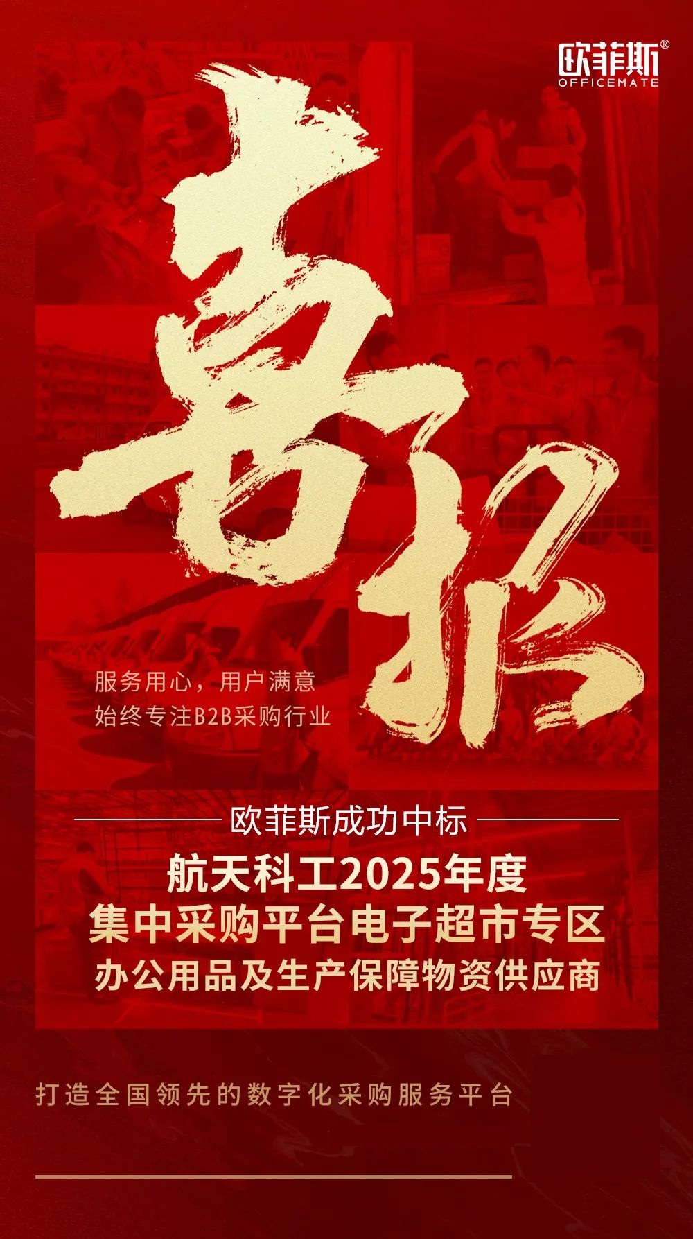 近日,欧菲斯集团股份有限公司凭借深厚的行业积淀、全链路数字化服务能力与完善的供应链体系,成功中标航天科工2025年度集中采购平台电子超市专区两大核心项目 —— 办公用品供应商与生产保障物资供应商,这一成果标志着欧菲斯在央企集中采购领域的服务实力再度获得认可,也为双方后续深化数字化采购合作奠定坚实基础...